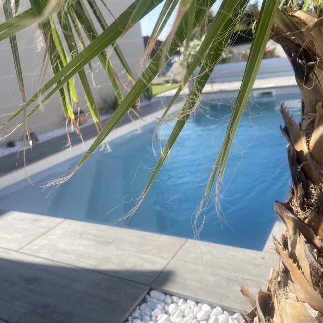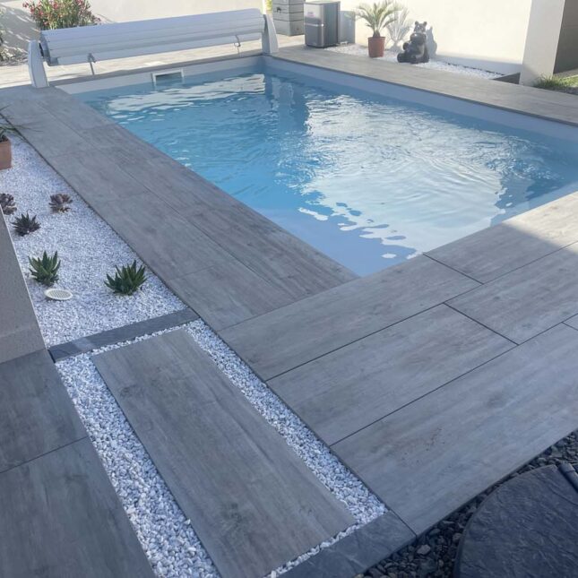 Nous avons décidé avec le client d’intégrer un tour de piscine dans la continuité de la nouvelle terrasse en gré ceram imitation bois de 120 x 40 cm, coupé par des insert de minéraux beige